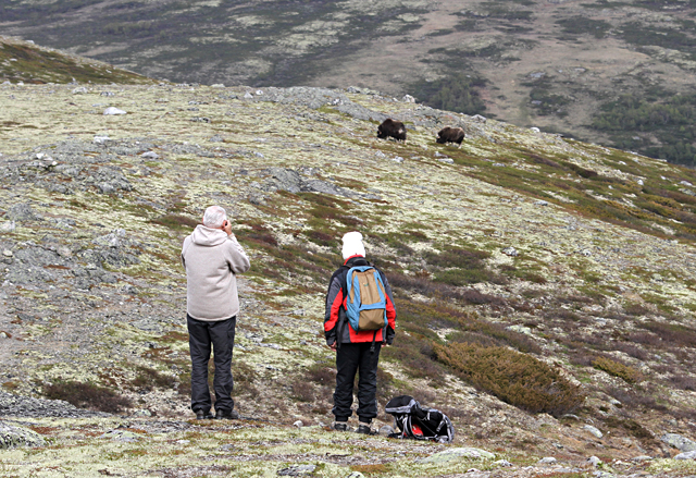 Men det er anbefalt å ikke gå nærmere enn 200 meter. Bruk heller kikkert og/eller kraftig teleobjektiv. Særlig er det viktig å holde seg på god avstand når dyra har kalver. Jeg gikk vel litt nærmere enn 200 meter for å få disse bildene, men det var mest fordi det var en "gal" tysker foran meg. Det var lett å se at moskusene hadde kontroll på mannen. Men jeg tror virkelig ikke han hadde kontroll på dem. Jeg holdt meg diskret i bakgrunnen. Jeg må innrømme at jeg så for meg mulige avisoverskrifter som: "Her angriper slag-moskusen!". Og med mine (svært kostbare) bilder, naturligvis.